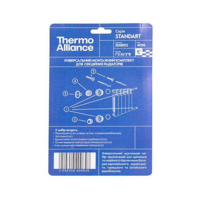 Комплект на радіатор Thermo Alliance Standart 1/2"х1" SD118152 - монтажний комплект для установки алюмінієвого радіатора. У комплект входить: кран Маєвського - 1 шт., кронштейн - 2 шт., заглушка - 1 шт., футорка - 4 шт.