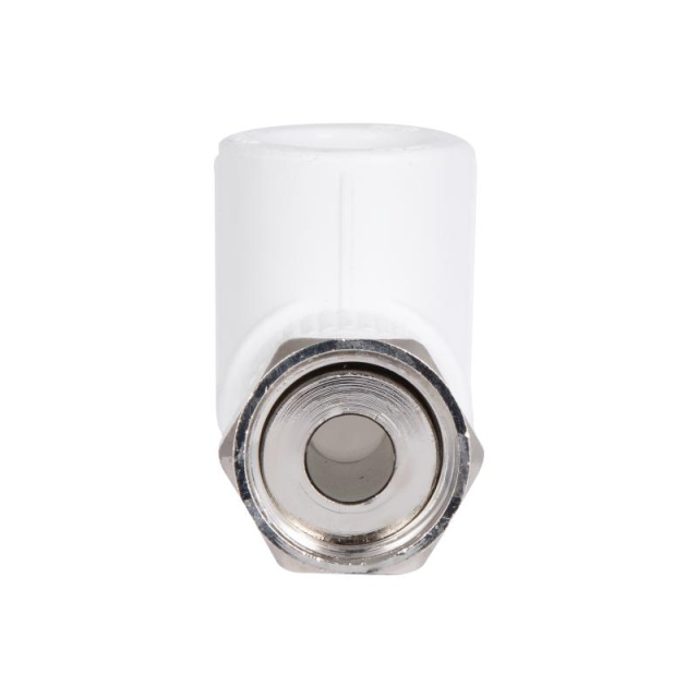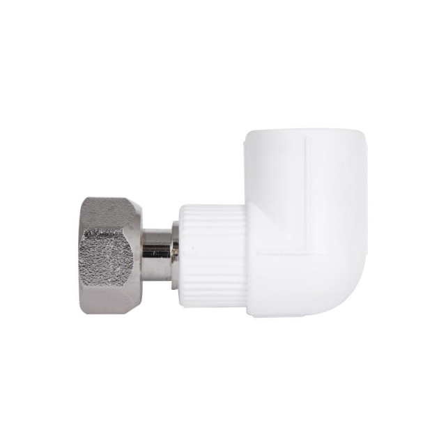 Кутик PPR Blue Ocean "Білий" з накидною гайкою 20х1/2", 90° ВР — фітинг із поліпропілену та латуні з вигнутим під прямим кутом корпусом.
