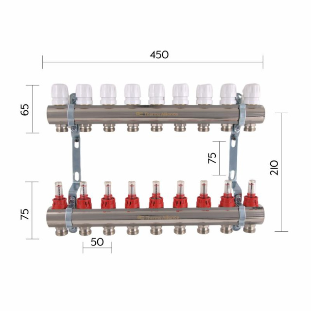 Колектор з витратомірами Thermo Alliance серії Standart 1"х9 SD235W9 використовується для розподілу води та контролю витрат у системах опалення та...