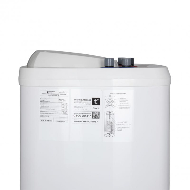 Thermo Alliance Vulcan CWH 12046 14S F – це водонагрівач підлогового монтажу непрямого нагріву у стильному прямокутному дизайні Square Jacket Design та шириною всього 45,5 см, завдяки чому легко вміщується навіть у вузьких нішах. Всі підключення розташовані у верхній кришці водонагрівача, що дозволяє компактно розмістити водонагрівач під опалювальним котлом із мінімальною кількістю гідравлічних з'єднань. Джерелом тепла в теплообміннику Thermo Alliance Vulcan є спіральний змійовик, який живиться від центрального опалення котла або каміна. За бажанням водонагрівач також може працювати від електронагрівача (опція ТЕН 1 1/4"). Конструкція водонагрівача також має на увазі циркуляційний контур ГВП, що дозволяє підключати зовнішній циркуляційний насос. Комфортну роботу водонагрівача забезпечує спіральний змійовик зі збільшеною площею поверхні.