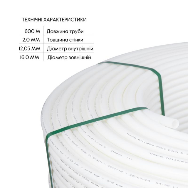Труба PEX-A EVOH WHITE діаметром 16x2 від Thermo Alliance, вироблена в Іспанії, є високоякісною трубопровідною системою з антикисневим бар'єром EVOH, яка запобігає корозії і збільшує термін служби системи опалення. Виготовлена за технологією PEX-A, труба має високу гнучкість, міцність і стійкість до високих температур, що робить її ідеальною для монтажу в системах теплої підлоги. Довжина 600 метрів забезпечує зручність та економічність при встановленні на великих площах.