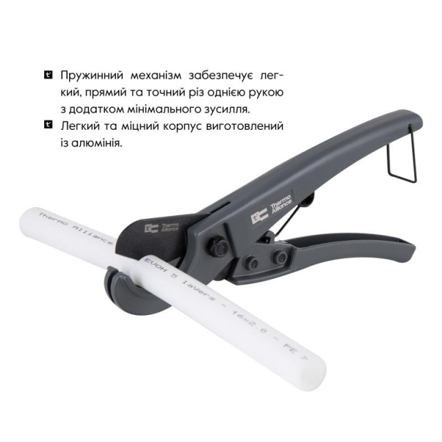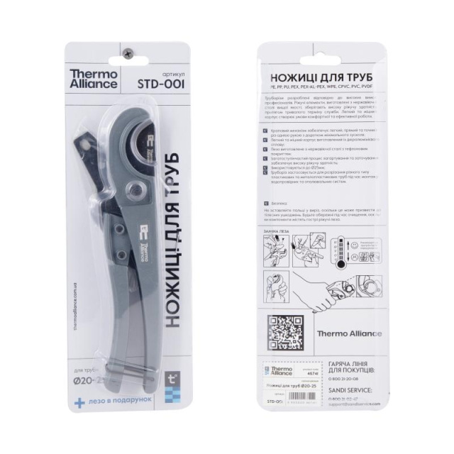 Ножиці для пластикових труб Thermo Alliance STD-001 призначені для професійного використання і відповідають високим стандартам якості. Ідеально підходять для різання полімерних труб діаметром до 25 мм. Ріжуча частина виконана з нержавіючої сталі преміум-класу з тефлоновим покриттям, що гарантує тривалу гостроту леза. Корпус виготовлений з легкого та міцного алюмінієвого сплаву, що забезпечує надійність та зручність у використанні. У комплекті додається запасне лезо.