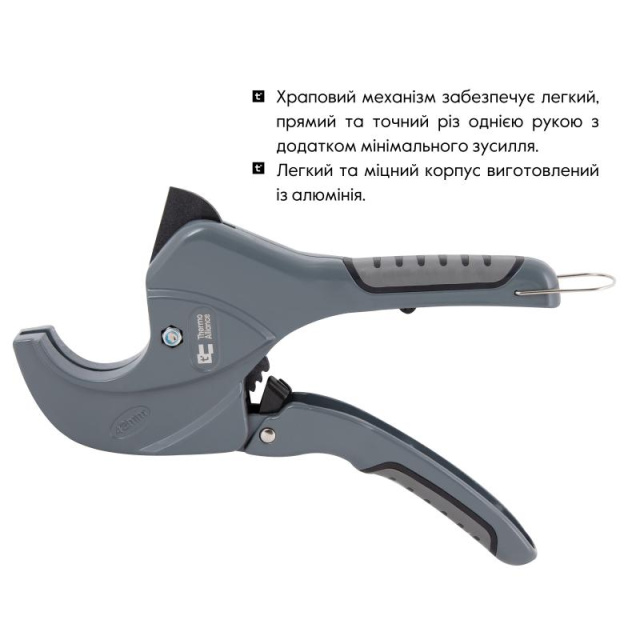Ножиці для пластикових труб Thermo Alliance модель PRO-001 створені для професійного використання і відповідають найвищим стандартам якості. Призначені для різання полімерних труб діаметром до 40 мм. Леза виготовлені з високоякісної нержавіючої сталі з тефлоновим покриттям, що забезпечує довговічну ріжучу здатність. Храповий механізм дозволяє виконувати точний і рівний зріз труб однією рукою з мінімальними зусиллями. Зручна ручка з антиковзким покриттям. Легкий і міцний корпус виготовлений з алюмінієвого сплаву. У комплекті передбачено запасне лезо. Вага ножиць - 385 гр.