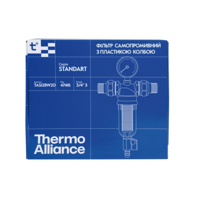 Самопромивний фільтр тонкого очищення Thermo Alliance серії Standart (арт. TAS128W20) із пластиковою колбою ефективно затримує дрібні домішки, захищаючи систему водопостачання та побутові прилади від забруднень. Функція самопромивки полегшує обслуговування, продовжуючи термін служби елемента, що фільтрує, а міцна пластикова колба забезпечує надійність і зручність контролю стану фільтра.