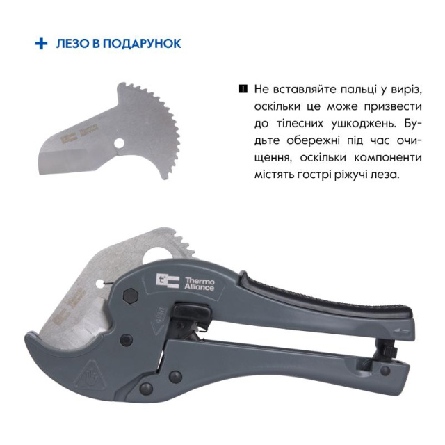 Ножиці для пластикових труб Thermo Alliance модель STD-003 створені для професіоналів та відповідають найвищим стандартам якості. Вони призначені для різання полімерних труб діаметром до 40 мм. Леза з нержавіючої сталі високої якості забезпечують тривалу гостроту та ефективність різання. Храповий механізм дозволяє легко, точно і прямо різати труби однією рукою, докладаючи мінімальних зусиль. Корпус виконаний з легкого та міцного алюмінієвого сплаву. Зручна ручка з антиковзким покриттям. У комплекті є запасне лезо. Вага ножиць –