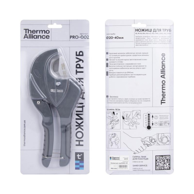 Ножиці для пластикових труб Thermo Alliance модель PRO-002 призначені для професійного використання та відповідають найвищим стандартам якості. Призначені для різання полімерних труб діаметром до 40 мм. Леза виготовлені із високоякісної нержавіючої сталі. Храповий механізм дозволяє робити точний і рівний зріз труб однією рукою з мінімальними зусиллями. Зручна ручка з антиковзким покриттям. Легкий та міцний корпус виготовлений з алюмінієвого сплаву. У комплекті передбачено запасне лезо.