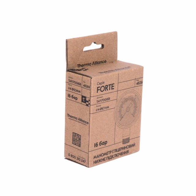 Thermo Alliance Forte TAF170G16B — гліцериновий манометр з діаметром корпусу 63 мм і латунним з’єднанням 1/4" З з нижнім підключенням....