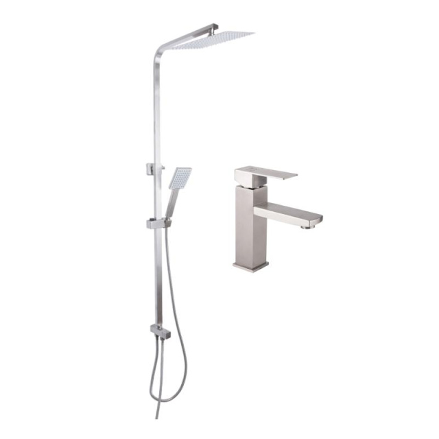 Комплект із змішувача для раковини та душової стійки серії Kubis. Відрізняється сучасним дизайном та нікелевим покриттям, що підходить для практичного облаштування ванної кімнати.