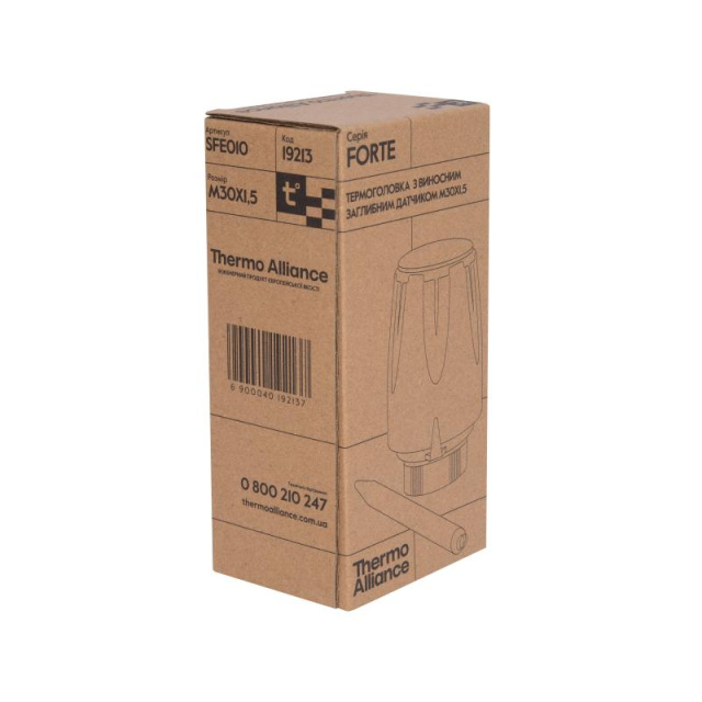 Термоголовка Thermo Alliance Forte SFE010 з виносним датчиком застосовується для збереження заданої температури теплоносія в постійному діапазоні з точністю до одного градуса, що дозволяє рівномірно розподілити теплоносій по всьому радіатору. Розмір підключення М30х1,5.