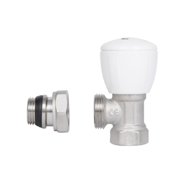 Кран радіаторний з антипотоком Thermo Alliance Standart Powerful 1/2" кутовий для регулювання теплового режиму. Матеріал виготовлення — латунь з нікельованим покриттям.